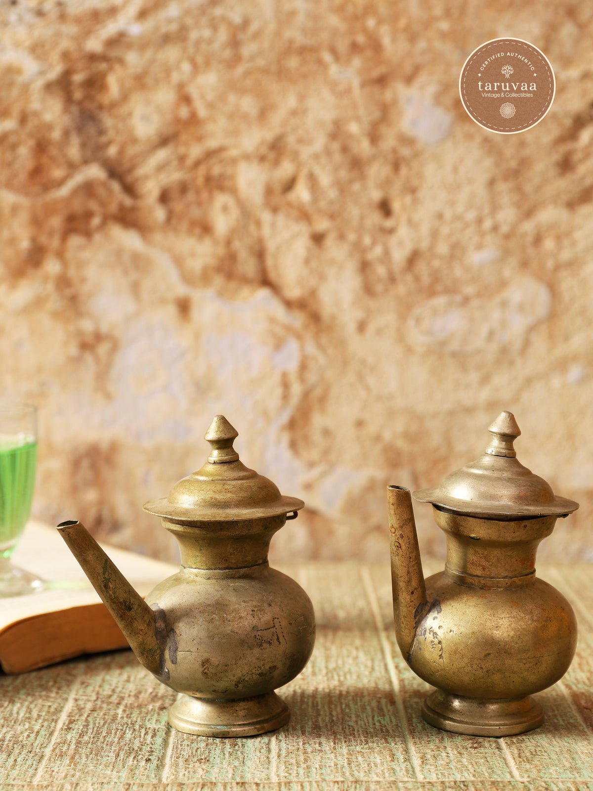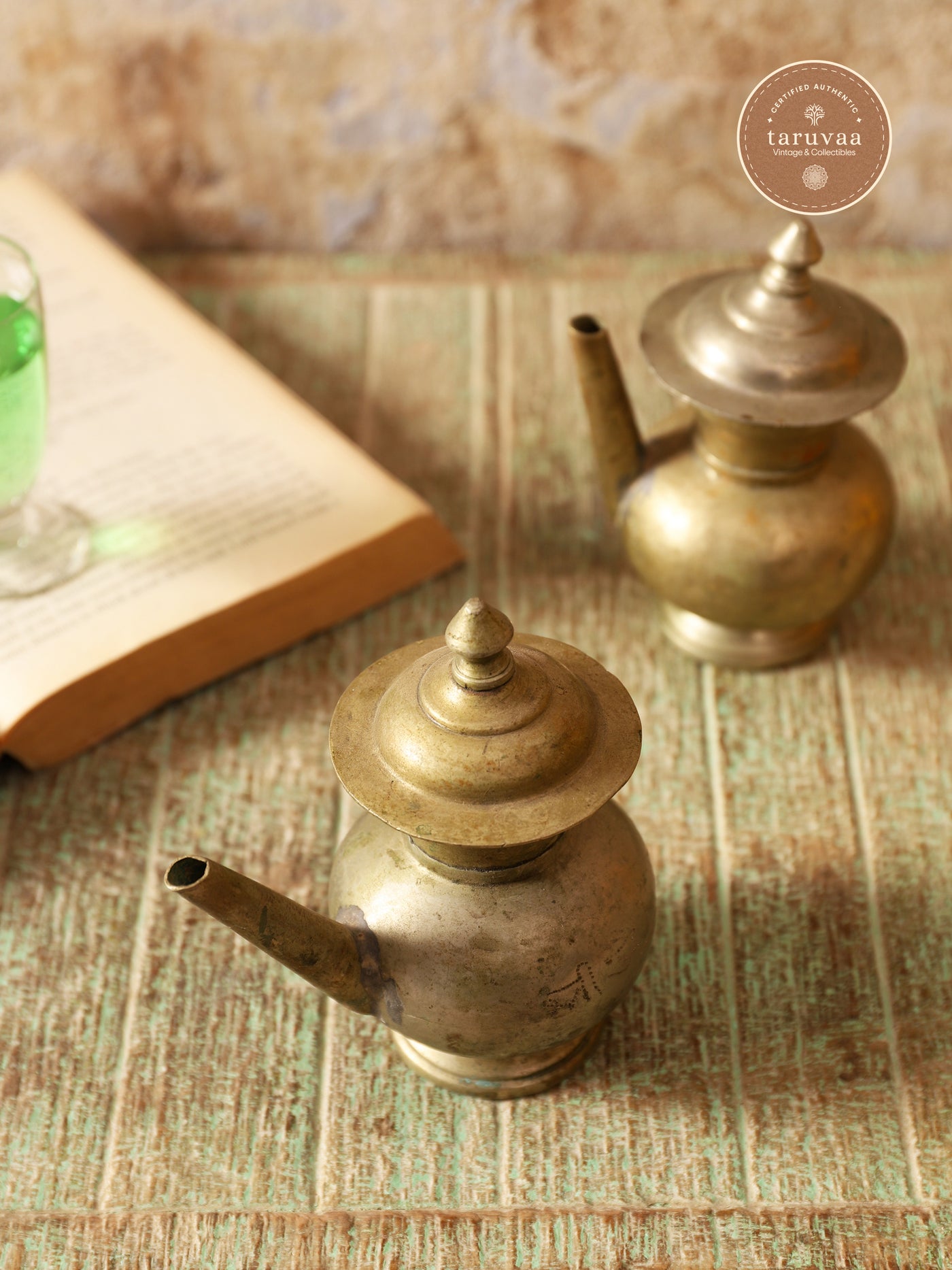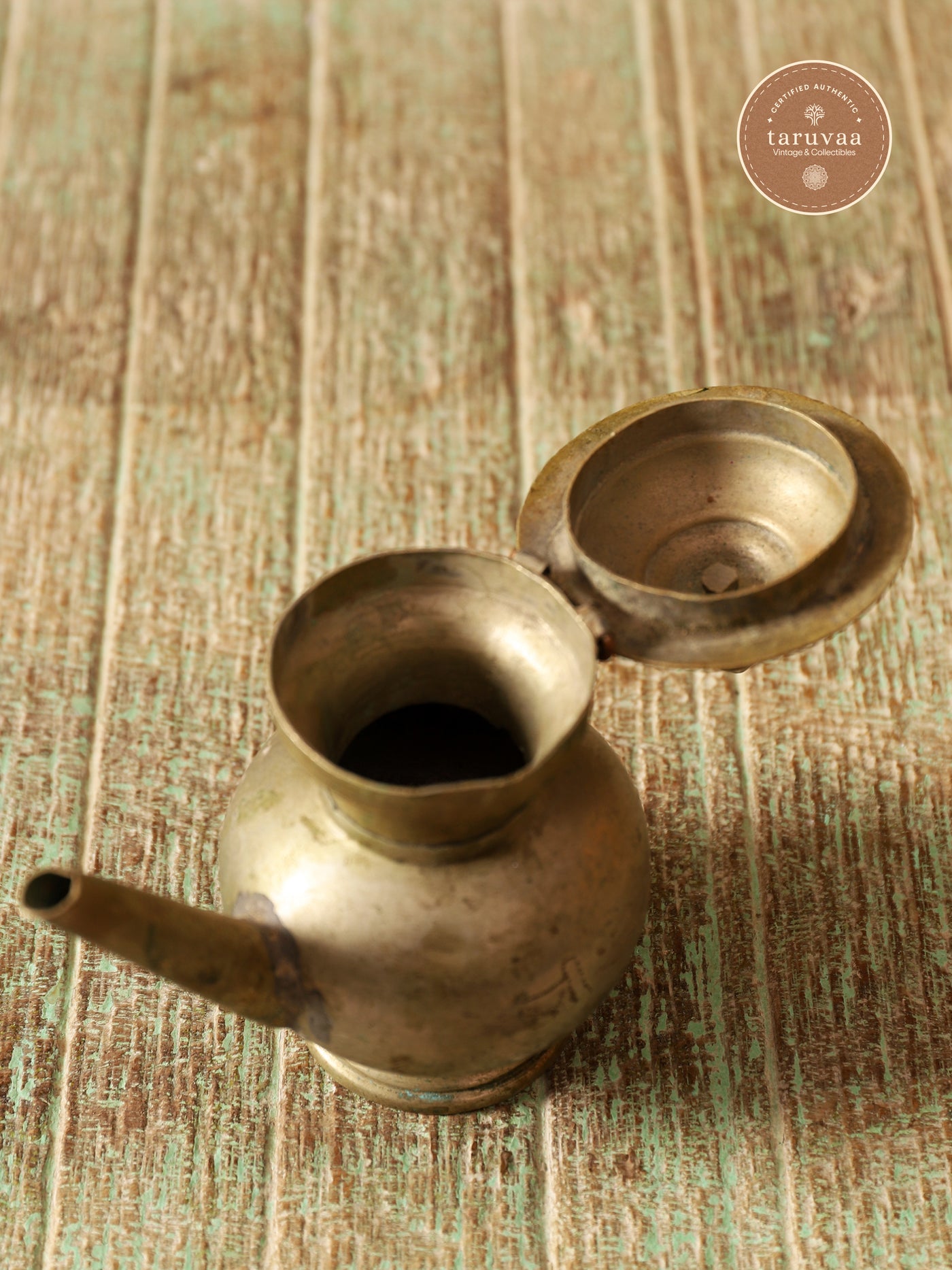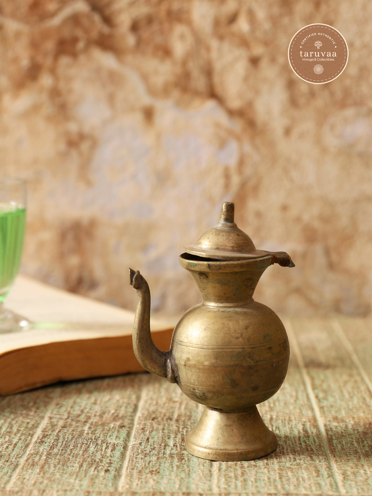 Handcrafted in antique brass for its sacred and antimicrobial essence, its wide spout allows for precise water offerings during puja, while the pointed lid ensures sanctity is sealed within.